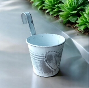 Metalowa osłonka na doniczkę z uchwytem – rustykalna dekoracja z sercem