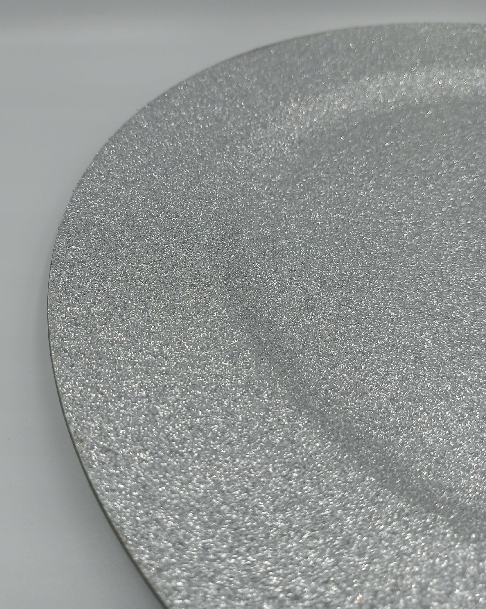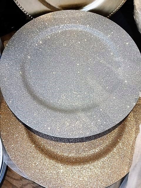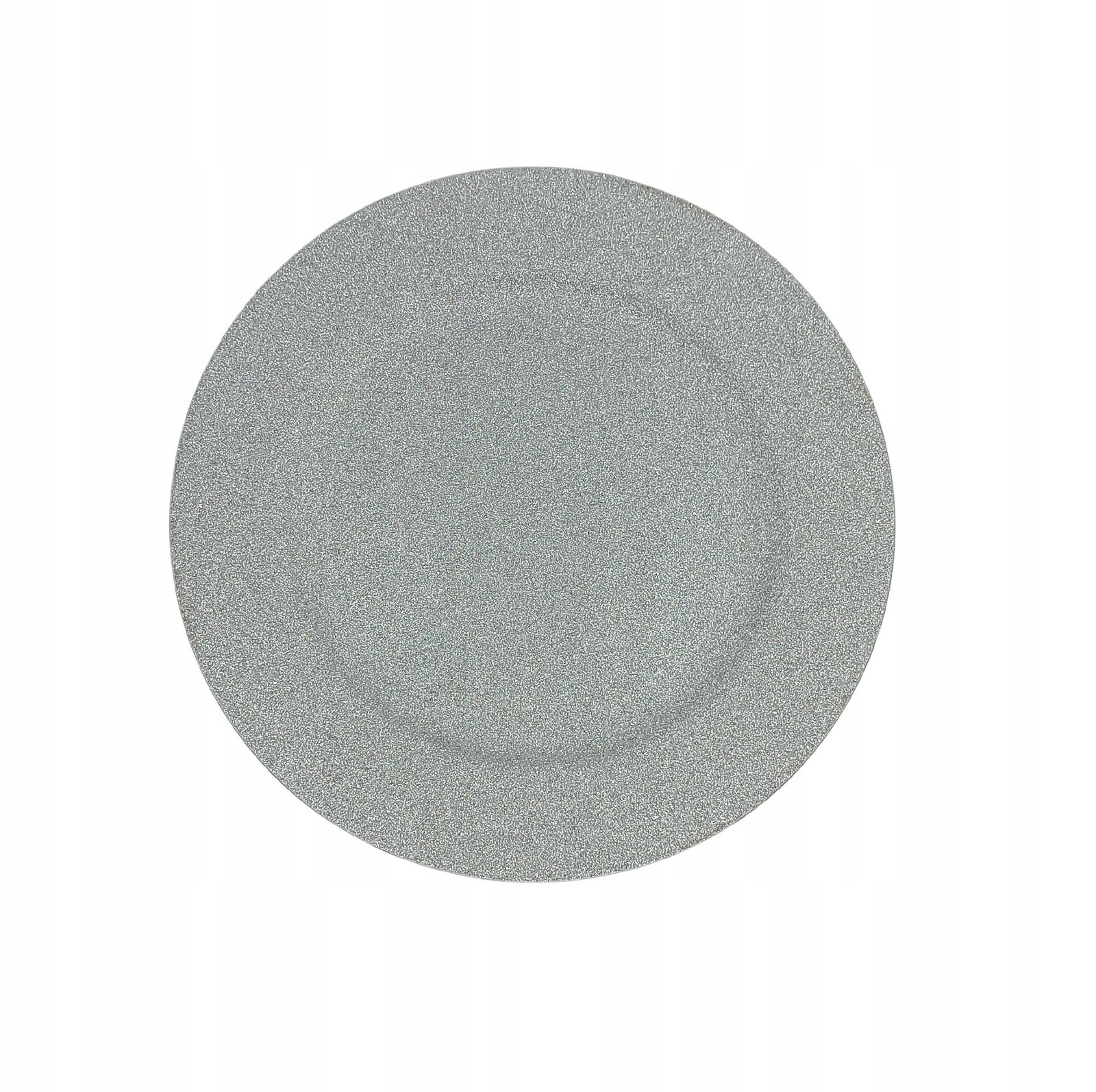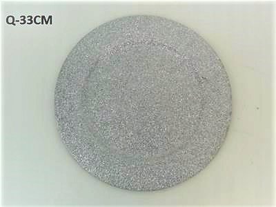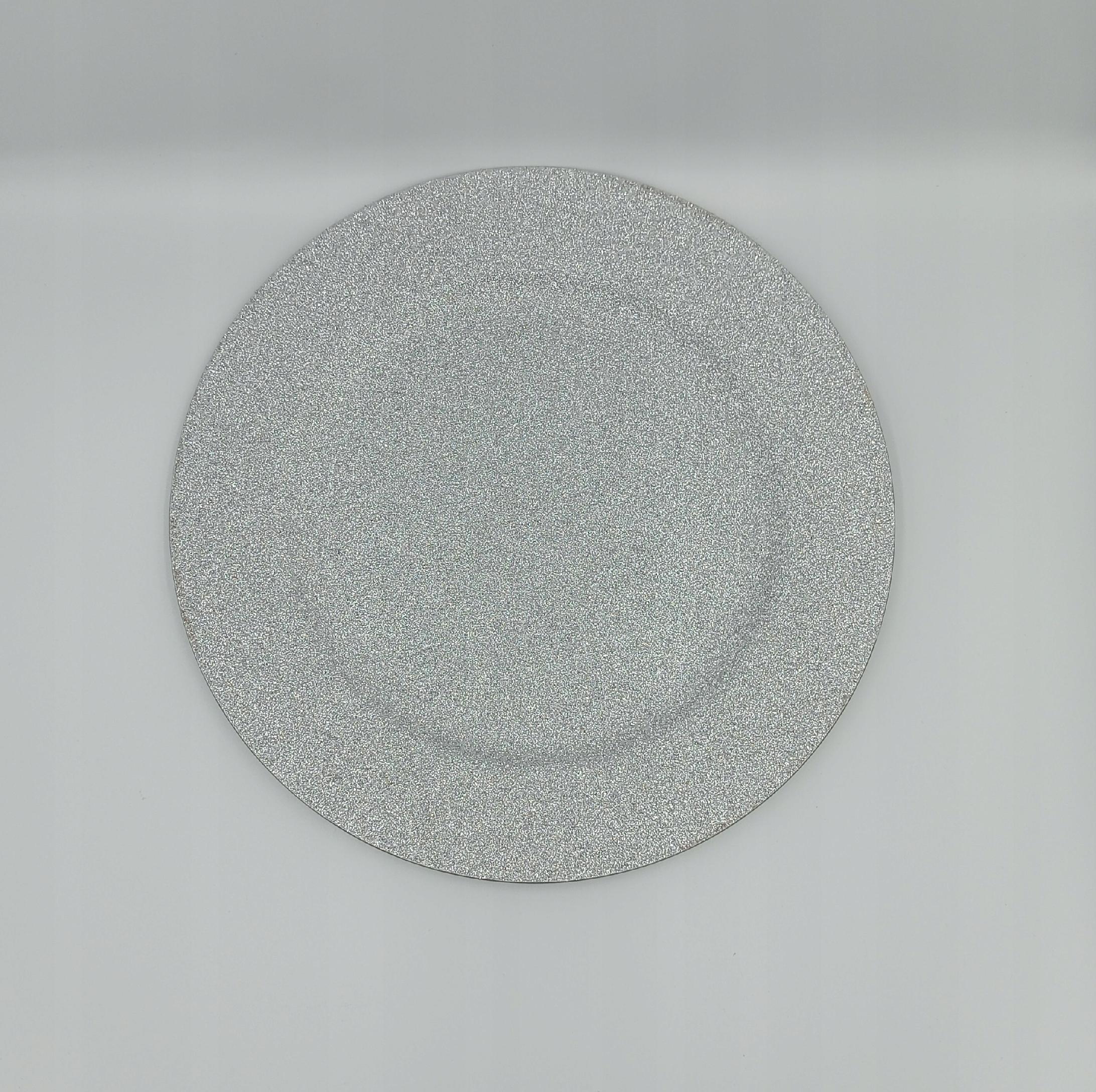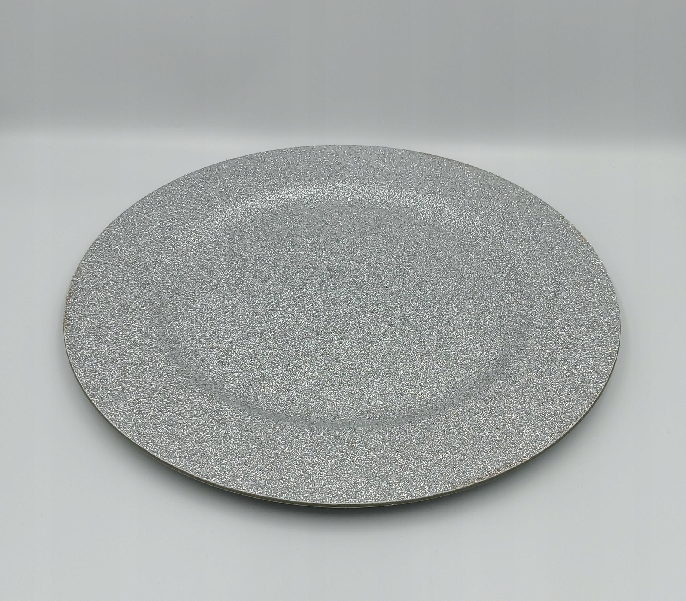 Srebrne podtalerze z brokatem o średnicy 33 cm.